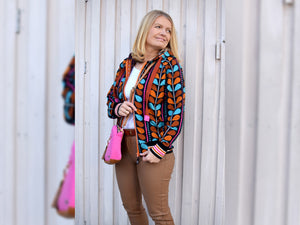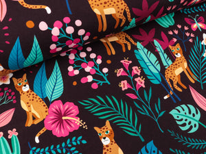 Der einzigartige Griff des Albstoffe Digitaldruck Baumwolljersey-Stoffes wird durch den Einsatz hochwertigster GOTS Bio Garne und einem idealen Stoffgewicht des Druckgrundes erreicht. Der sitzende Leopard ist ca. 11,4cm hoch. Kollektion: Sparkle Farbe: bordeaux - bunt Design: In the Jungle Material: 95% kbA Bio-Baumwolle / 5% Elastan Breite: 165cm (Extrabreit) Gewicht: ca.365g / Laufmeter Waschbar bei 30 Grad auf Links, bügeln...
