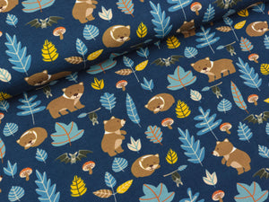 Reststück 34cm - Steinbeck Baumwolljersey Woody Familie Braunbär im Wald auf Dunkelblau