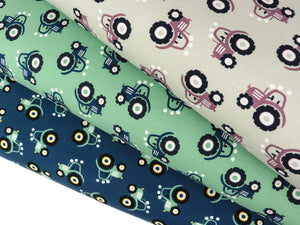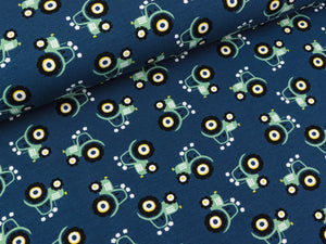 Ein weicher Baumwolljerseystoff mit kleinen Traktoren. Die Traktoren sind ca. 3,5cm lang und 3,2cm hoch. Motiv: Mini Tractor Farbe: lapis blue - greenery - gelb - weiß - schwarz Material: 95% Baumwolle / 5% Elastan Breite: 150 cm Gewicht: ca. 210 g/m² Zertifizierung: Öko-Tex-Standard 100 Waschbar bei 30 Grad, bitte keine Waschmittel mit optischem Aufheller verwenden.