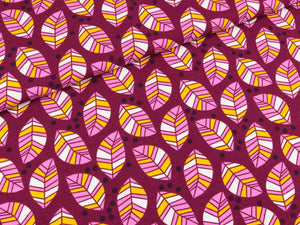 Wunderschöner Baumwolljersey aus der Serie Granny`s Garden mit einem Design von Blaubeerstern. Muster: Blätter Farbe: beere - bunt Material: 95% Baumwolle / 5% Elastan Breite: 155cm Zertifizierung: Öko-Tex-Standard 100 Waschbar bei 30 Grad.