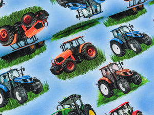 Weicher elastischer Baumwolljersey Tim mit verschiedenen Traktoren. Der rote Traktor ist ca. 10,1cm breit und 7,4cm hoch. Super geeignet für Shirts, Kleider, Röcke, Pullis und vieles mehr. Der Stoff ist sehr gut dehnbar. Farbe: himmelblau - bunt Muster: Traktoren Material: 92% Baumwolle / 8% Elastan Breite: 160cm Gewicht: ca. 220 g/m² Zertifizierung: Öko-Tex-Standard 100 Waschbar bei 30 Grad, bitte keine...