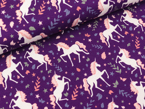Weicher elastischer Baumwolljersey aus der Serie "Klaas" von Swafing Stoffe. Super geeignet für Shirts, Kleider, Röcke, Pullis und vieles mehr. Der Stoff ist sehr gut dehnbar. Muster: Einhörner Farbe: lila - bunt Material: 95% Baumwolle / 5% Elastan Breite: 160cm Gewicht: 200g/m² Zertifizierung: Öko-Tex-Standard 100 Waschbar bei 30 Grad, bitte keine Waschmittel mit optischem Aufheller verwenden.