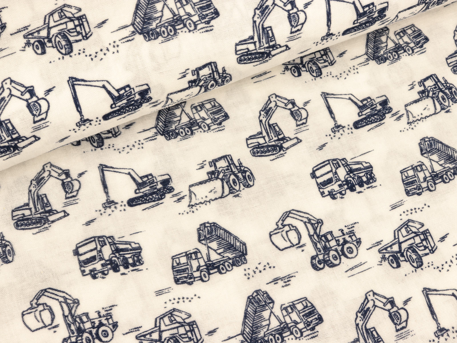 Endlich sind die tollen Musselin Stoffe da! Musselin mit Baustellenfahrzeugen.