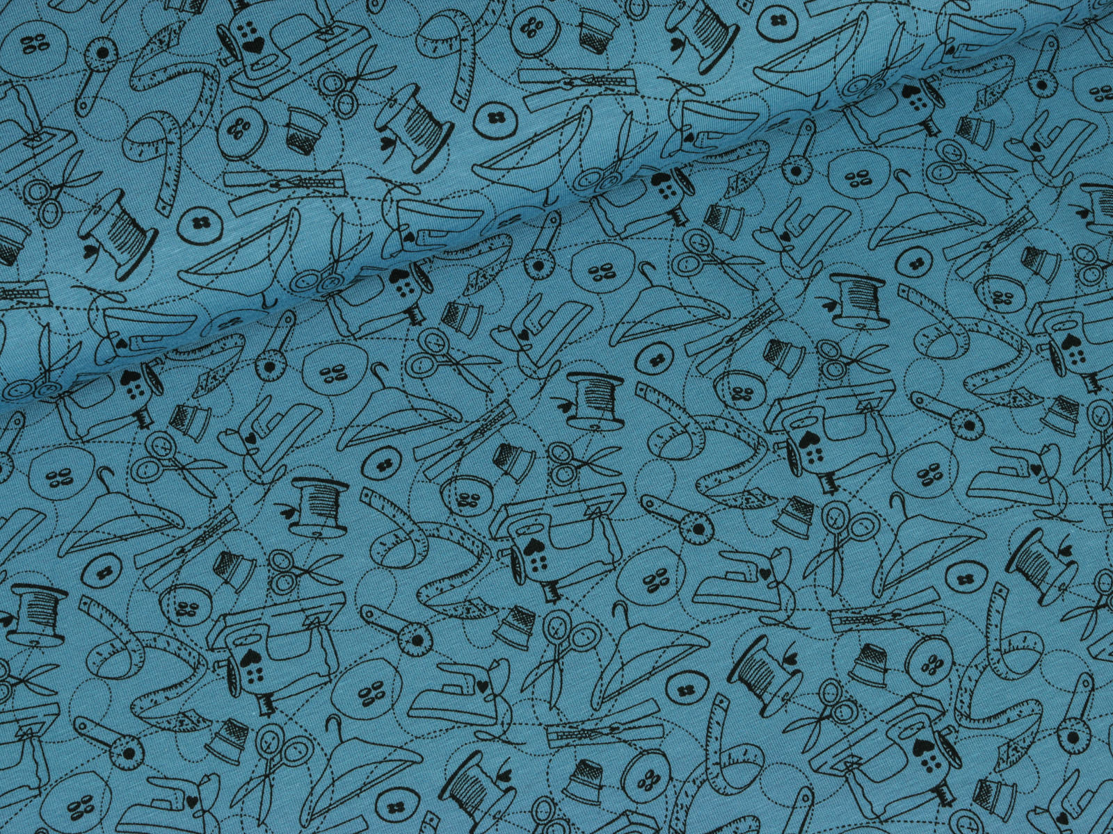 Kleine Nähutensilien, wie Schere, Nähmaschine, Bügeleisen, Rollschneider, Garn und Knöpfe tummeln sich auf dem süßen Stoff!