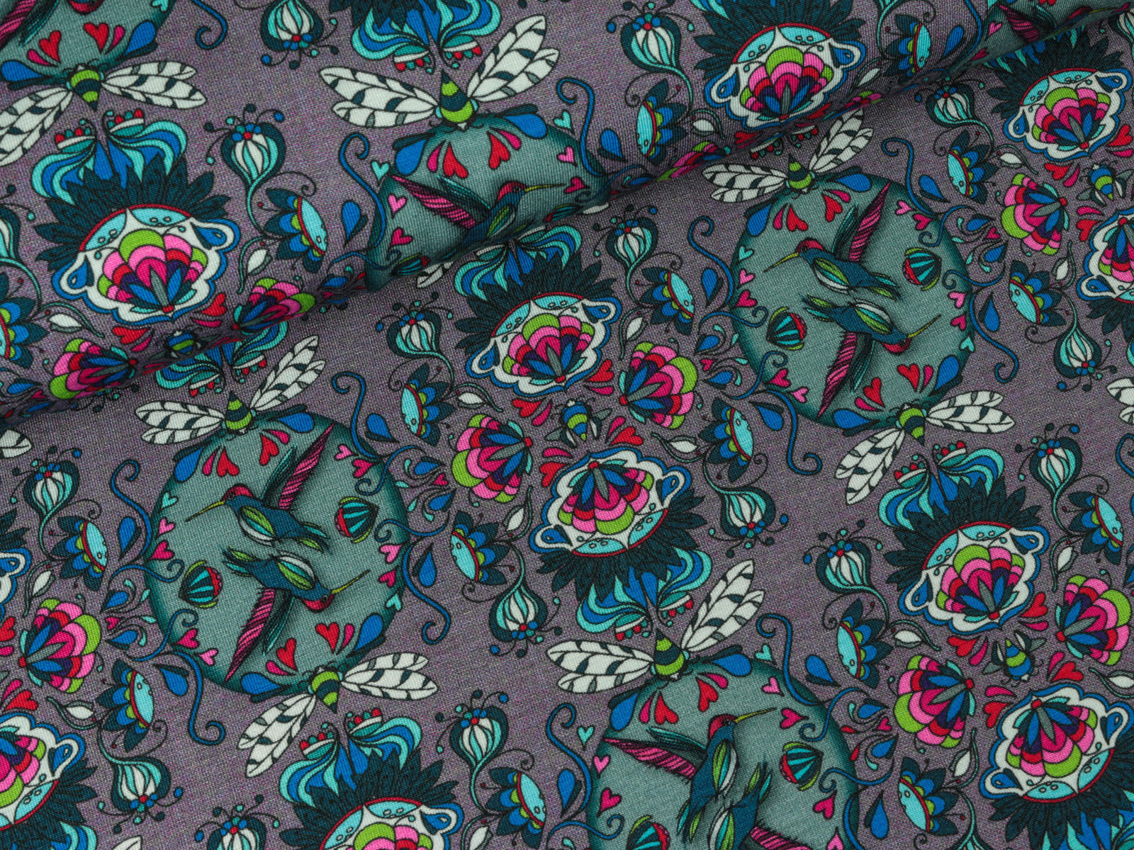 Die neue Lila-Lotta Kollektion ist für den Damenbereich gedacht, aber auch durchaus für Kinder einsetzbar. Das riesige und farbenfrohes Sortiment hochwertiger Stoffqualitäten ist optimal auf die Modetrendfarben 2016/2017 abgestimmt. Man findet sowohl Petrol, Marsala, verschiedene Grüntöne, Rose und Grautöne – allesamt im edlen Lila-Lotta Stil kunstvoll arrangiert. Zarte Kolibris, stilisierte Blüten, prächtige Ornamente, zarte Libellen – an Donna kann man sich kaum sattsehen.