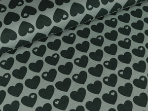 Wundervoller weicher Baumwollsweat mit einem Motiv von Graziela aus dem Jahr 1975. Perfekt für Hoodies, Hosen, Mützen, Schals und vieles mehr. Die Herzen sind 3cm breit und ca. 2,7cm hoch. Der Stoff ist elastisch. Farbe: schwarz Hintergrund: grau Material: 95%Baumwolle/5%Elastan Breite: 150cm Zertifizierung: Öko-Tex-Standard 100 Waschbar bei 30 Grad, bitte keine Waschmittel mit optischem Aufheller verwenden.