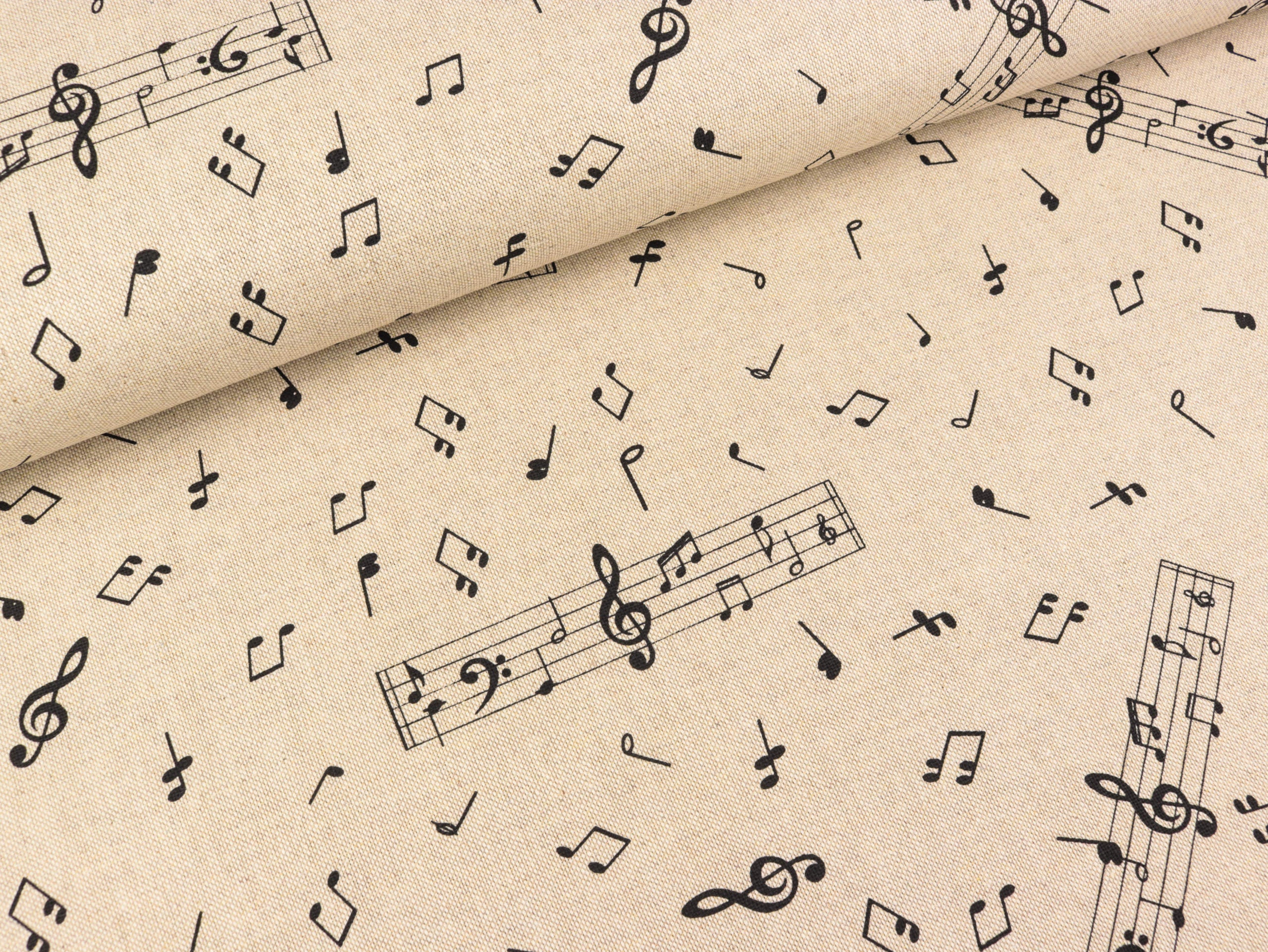 Griffiger Dekostoff mit verschiedenen Blättern. Bestens geeignet für Kissen, Taschen, Einkaufstaschen und vieles mehr. Der Notenschlüssel ist ca. 3,5cm hoch. Farbe: schwarz - natur Material: 80% Baumwolle / 20% Polyester Breite: 140cm Gewicht: ca. 200g/m² Waschbar bei 30 Grad, bügeln Stufe 2 von der linken Seite