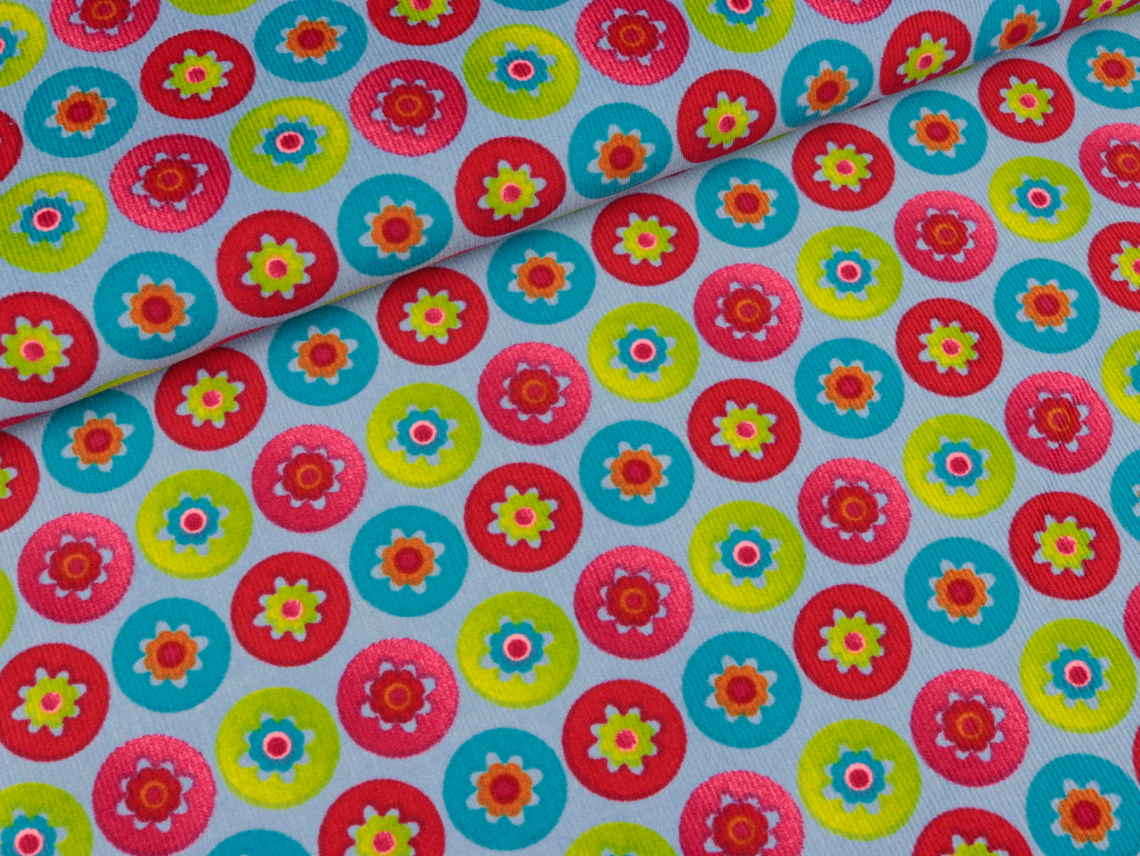 Schöner weicher Cordstoff "Pickwick" in der Grundfarbe rauchblau mit bunten Blumenkreisen.