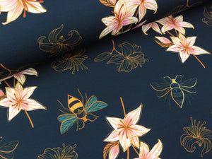 Der einzigartige Griff des Albstoffe Digitaldruck Baumwolljersey-Stoffes wird durch den Einsatz hochwertigster GOTS Bio Garne und einem idealen Stoffgewicht des Druckgrundes erreicht. Entlang einer Webkante verläuft ein bunter Bordürenstreifen. Dieser hat eine Breite von ca. 13cm. Kollektion: Glossy Farbe: blue navy - bunt Design: Petit Bloom Material: 95% kbA Bio-Baumwolle / 5% Elastan Breite: 150cm Gewicht: ca. 365g / Laufmeter...