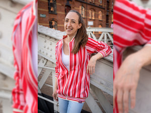 Hochwertiger 3-Farb-Jacquard-Jersey aus der Bloom Kollektion von Hamburger Liebe für Albstoffe. Der Stoff ist innen nicht angeraut und kann sehr gut für sommerliche Kleidung verwendet werden. Muster: Pin Stripes Farbe: flamme - rosa scuro - weiß Kollektion: Bloom Die schmalen unterbrochenen Streifen haben eine Breite von ca. 0,25cm. Die Streifen verlaufen längs. Material: 100% kbA Bio-Baumwolle Breite: 150cm Gewicht: ca....