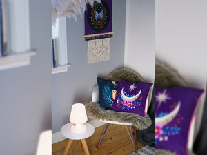 Der einzigartige Griff des Albstoffe Digitaldruck Baumwollsweatstoffes in French Terry Qualität wird durch den Einsatz hochwertigster GOTS Bio Garne und einem idealen Stoffgewicht des Druckgrundes erreicht. Der Stoff ist innen nicht angeraut. Entlang einer Webkante verläuft ein bunter Bordürenstreifen. Dieser hat eine Breite von ca. 12cm. Die Motten sind ca. 8,9cm hoch. Kollektion: Midnight Farbe: ciclamino - bunt - blue...