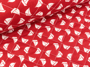 Doubleface Steppstoff einer maritimen Serie von Hemmers Itex. Der Stoff eignet sich für Jacken, Westen, Taschen, Kissen, Rucksäcke und vieles mehr. Eine Außenseite ist mit kleinen weißen Schiffen bedruckt, die Innenseite hat ein unregelmäßiges Streifenmuster. Die Segelschiffe sind ca. 1,8cm hoch. Stoffdicke: ca. 0,5cm Muster: Kleine Segelschiffe und bunte unregelmäßige Streifen Farbe außen: rot - weiß Farbe innen: rot -...