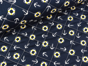 Doubleface Steppstoff einer maritimen Serie von Hemmers Itex. Der Stoff eignet sich für Jacken, Westen, Taschen, Kissen, Rucksäcke und vieles mehr. Eine Außenseite ist mit kleinen Ankern und Rettungsringen bedruckt, auf Innenseite befinden sich kleine Anker. Die Anker außen sind ca. 1,5cm hoch, die Rettungsringe haben einen Durchmesser von ca. 1,8cm. Die Anker innen sind ca. 1,5cm hoch. Stoffdicke: ca....