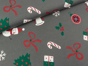 Weicher, elastischer und Baumwolljersey "Glitter Christmas" mit einem aufgedrucktem Weihnachtsmotiv. Die roten Elemente sind mit Glitzerpartikeln überzogen. Der Schneemann ist ca. 8cm hoch. Muster: Glitter Christmas Farbe: grau - bunt Material: 95% Baumwolle / 5% ElastanBreite: 145cm Gewicht: ca. 200g/m² Zertifizierung: Öko-Tex-Standard 100 Waschbar bei 30 Grad. Bitte immer auf Links waschen. Nicht in den Trockner geben und nur von...