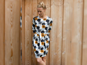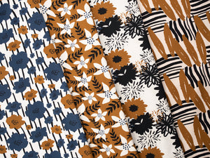 Weicher elastischer Baumwolljersey aus der Serie "Johanna" von Swafing Stoffe. Super geeignet für Shirts, Kleider, Röcke, Pullis und vieles mehr. Der Stoff ist sehr gut dehnbar. Muster: Blüten Farbe: ocker - schwarz - weiß - bunt Material: 90% Baumwolle / 10% Elastan Breite: 155cm Gewicht: 230g/m² Zertifizierung: Öko-Tex-Standard 100 Waschbar bei 30 Grad, bitte keine Waschmittel mit optischem Aufheller verwenden.