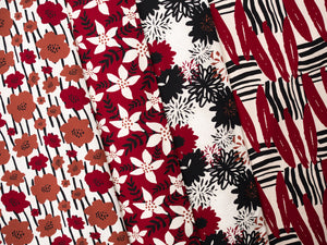 Weicher elastischer Baumwolljersey aus der Serie "Johanna" von Swafing Stoffe. Super geeignet für Shirts, Kleider, Röcke, Pullis und vieles mehr. Der Stoff ist sehr gut dehnbar. Muster: Blumen und Streifen Farbe: burgundy - ziegel - schwarz - weiß Material: 90% Baumwolle / 10% Elastan Breite: 155cm Gewicht: 230g/m² Zertifizierung: Öko-Tex-Standard 100 Waschbar bei 30 Grad, bitte keine Waschmittel mit optischem...