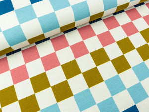 Weicher French Terry "Squares" von Lila-Lotta für Swafing Stoffe. Der Stoff ist innen nicht angeraut. Squares ist ein French Terry mit einem schlichten, trendigen Muster. Die 3cm großen Karos in Dunkelblau, Royalblau, Türkis, Ocker und Koralle lassen sich wunderbar mit Swafing Basics kombinieren. Der Stoff eignet sich bestens für Sweatshirt's, Kleider, Röcke, Jumpsuits, Jacken, Leggings und vieles mehr. Muster: Squares...