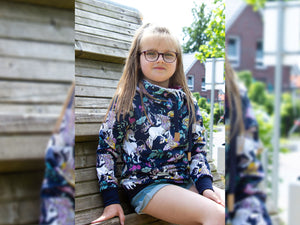 French Terry "Petra" von Swafing Stoffe mit romantischen Einhörnern. Die Mähnen der Einhörner und die fantasievollen Blumenmotive sind mit traumhaften Pastellfarben coloriert. Der Stoff ist innen nicht angeraut. Die stehenden Einhörner haben eine Höhe von ca. 16cm. Muster: Romantische Einhörner Farbe: tiefblau - bunt Material: 95% Baumwolle / 5% ElastanBreite: 160cm Gewicht: 245g/m² Zertifizierung: Öko-Tex-Standard 100 Waschbar bei 30 Grad....