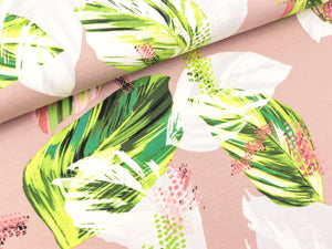 Weich fallender Viskosejersey "Selina" aus der Frühjahr-/Sommerkollektion 2022 von Swafing Stoffe. Für luftige Shirts, Kleider, Leggings und vieles mehr. Muster: Große Blätter Farbe: altrosa - bunt Material: 94% Viskose / 6% Elastan Breite: 160cm Zertifizierung: Öko-Tex-Standard 100 Gewicht: 220 g/m² Waschbar bei 30 Grad auf Links, bitte keine Waschmittel mit optischem Aufheller verwenden. Nicht in den Trockner geben.