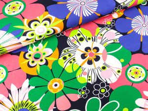 Weich fallender Viscosejersey mit einem Retromuster. Für Shirts, Kleider, Leggings, Röcke, Wickelblusen und vieles mehr bestens geeignet. Muster: Große Retroblumen Farbe: grün - lila - weiß - bunt Material: 95% Viskose / 5% Elastan Breite: 160cm Zertifizierung: Öko-Tex-Standard 100 Gewicht: ca. 200g/m² Waschbar bei 30 Grad auf Links, bitte keine Waschmittel mit optischem Aufheller verwenden. Nicht in den Trockner geben.