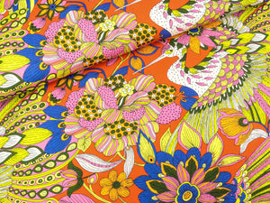 Weich fallender Viscosejersey mit einem Retromuster. Für Shirts, Kleider, Leggings, Röcke, Wickelblusen und vieles mehr bestens geeignet. Muster: Große Paradiesvögel und Blumen Farbe: orangerot - bunt Material: 95% Viskose / 5% Elastan Breite: 160cm Zertifizierung: Öko-Tex-Standard 100 Gewicht: ca. 200g/m² Waschbar bei 30 Grad auf Links, bitte keine Waschmittel mit optischem Aufheller verwenden. Nicht in den Trockner geben.