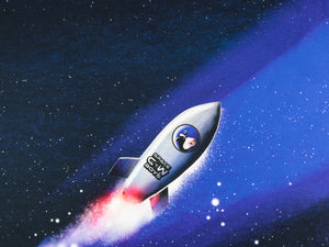 Der Space Cowboy ist in seiner Rakete auf der große Reise ins Universum. Die witzige Astronauten-Kuh ist auf der linken Seite des ca. 75 cm hohen Panels als rundes Hauptmotiv von ca. 20cm Durchmesser zu sehen, rechts unten sieht man ihre Rakete starten. Dunkelblauer Hintergrund mit unzähligen Sternen und leuchtend royalblauen Akzenten! Das Panel ist 75 cm hoch. Das Motiv...