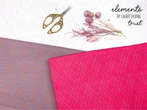 Der Baumwolljersey "Trust" wirkt von weitem ganz dezent, auf den zweiten Blick und wenn man näher kommt, entdeckt man das interessante Muster aus Rauten und Stepplinien. Der Hintergrund wirkt durch die Linienstrukturen leicht meliert! Für sich alleine oder mit den plakativeren Motiven kombiniert wunderschön! Kollektion: Elements by Cherry Picking Muster: Rauten und Linien Farbe: mauve - orange Material: 95% Baumwolle...