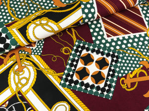 Weich fallender Viscosejersey mit einem gepatchten maritimen Muster. Für Shirts, Kleider, Leggings, Röcke, Wickelblusen und vieles mehr bestens geeignet. Muster: Maritim Anker und Taue Farbe: bordeaux - bunt Material: 95% Viskose / 5% Elastan Breite: 150cm Zertifizierung: Öko-Tex-Standard 100 Gewicht: 210g/m² Waschbar bei 30 Grad auf Links, bitte keine Waschmittel mit optischem Aufheller verwenden. Nicht in den Trockner geben.