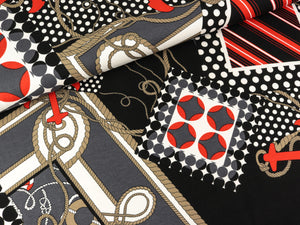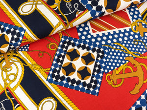 Weich fallender Viscosejersey mit einem gepatchten maritimen Muster. Für Shirts, Kleider, Leggings, Röcke, Wickelblusen und vieles mehr bestens geeignet. Muster: Maritim Anker und Taue Farbe: rot - bunt Material: 95% Viskose / 5% Elastan Breite: 150cm Zertifizierung: Öko-Tex-Standard 100 Gewicht: 210g/m² Waschbar bei 30 Grad auf Links, bitte keine Waschmittel mit optischem Aufheller verwenden. Nicht in den Trockner geben.