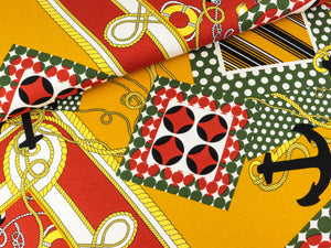 Weich fallender Viscosejersey mit einem gepatchten maritimen Muster. Für Shirts, Kleider, Leggings, Röcke, Wickelblusen und vieles mehr bestens geeignet. Muster: Maritim Anker und Taue Farbe: senfgelb - bunt Material: 95% Viskose / 5% Elastan Breite: 150cm Zertifizierung: Öko-Tex-Standard 100 Gewicht: 210g/m² Waschbar bei 30 Grad auf Links, bitte keine Waschmittel mit optischem Aufheller verwenden. Nicht in den Trockner geben.