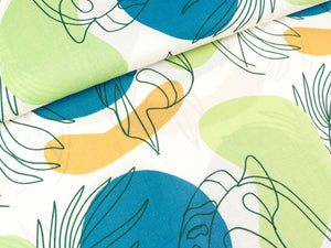 Hochwertiger bedruckter Viskoseleinen-Stoff "Lizzy" FS22 von Swafing Stoffe. Der Stoff hat eine weiche Oberfläche und fällt leicht fließend. Farbe: hellgrün - ocker - blau - weiß - dunkelgrün Muster: Stilisierte Blätter Bestens geeignet für Kleider, Blusen, Röcke, Hosen oder Schals. Material: 85% Viskose / 15% Leinen Breite: 135cm Gewicht: 110g/m² Zertifizierung. Öko-Tex-Standard 100 Waschbar bei 30 Grad auf Links, bügeln...