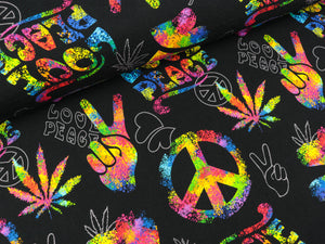 Wunderschöner weicher French Terry, bedruckt mit einem Muster. Der Stoff ist innen nicht angeraut. Muster: Love and Peace Farbe: schwarz - bunt Material: 95% Baumwolle / 5% ElastanBreite: 160cm Gewicht: 245g/m² Zertifizierung: Öko-Tex-Standard 100 Waschbar bei 30 Grad. Bitte immer auf Links waschen. Nicht in den Trockner geben und nur von Links bügeln auf Stufe 1.