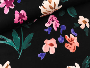 Weicher und wunderschöner French Terry, digital bedruckt mit einem bunten Blumenmuster von Nerida Hansen. Der Stoff ist innen nicht angeraut. Der Stoff eignet sich hervorragend für Kleider, Röcke, Pulli's, Hosen und vieles mehr. Muster: Colette Blumenmuster Farbe: schwarz - bunt Material: 95% Baumwolle / 5% Elastan Breite: 148cm Gewicht: 232g/m² Zertifizierung: Öko-Tex-Standard 100 Waschbar bei 30 Grad auf Links, bügeln...