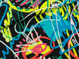 Der einzigartige Griff des Albstoffe Digitaldruck Baumwollsweat-Stoffes in French Terry Qualität wird durch den Einsatz hochwertigster GOTS Bio Garne und einem idealen Stoffgewicht des Druckgrundes erreicht. Der Stoff ist innen nicht angeraut. Entlang einer Webkante verläuft ein bunter Bordürenstreifen. Dieser hat eine Breite von ca. 13,5cm. Kollektion: BLING BLING Farbe: schwarz - bunt Design: Blue Bell Material: 95% kbA Bio-Baumwolle...