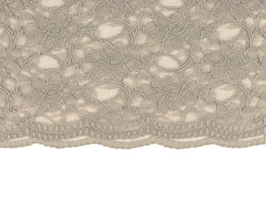Wunderschöne Spitze mit einer an der Webkante verlaufenden Bogenkante. Die Bogenkante ist auf beiden Seiten. Die Spitze ist leicht dehnbar. Farbe: hellgrau Material: 45%Baumwolle/55%Nylon Breite: 135cm Gewicht: ca. 160g/m² Waschbar bei 30 Grad Feinwäsche in einem Wäschenetz und nicht in den Trockner geben. Bügeln Stufe 1.