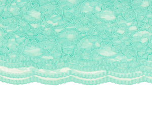 Wunderschöne Spitze mit einer an der Webkante verlaufenden Bogenkante. Die Bogenkante ist auf beiden Seiten. Die Spitze ist leicht dehnbar. Farbe: mint Material: 45%Baumwolle/55%Nylon Breite: 135cm Gewicht: ca. 160g/m² Waschbar bei 30 Grad Feinwäsche in einem Wäschenetz und nicht in den Trockner geben. Bügeln Stufe 1.