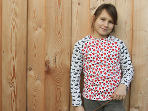 Weicher elastischer Baumwolljersey aus der Serie "Theo" von Swafing Stoffe. Super geeignet für Shirts, Kleider, Röcke, Pullis und vieles mehr. Der Stoff ist sehr gut dehnbar. Die Tupfen haben einen Durchmesser von ca. 0,8cm. Muster: Herzen und Tupfen Farbe: weiß - rot - tiefblau Material: 95% Baumwolle / 5% Elastan Breite: 160cm Gewicht: ca. 200g/m² Zertifizierung: Öko-Tex-Standard 100 Waschbar bei...