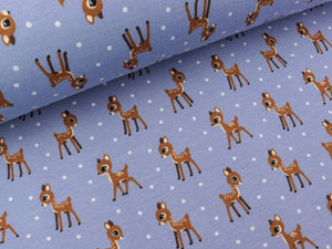 Wundervoller weicher Happy Fleece. Perfekt für Hoodies, Hosen, Decken, Jacken, Schals, Mützen und vieles mehr. Außen wie ein normaler Sweatshirtstoff, innen ist ein kuschelweicher Kurzflorplüsch. Die kleine Rehe haben eine Höhe von ca. 4,3cm. Muster: Kleine Rehe im Schnee Farbe außen: hellblau - bunt Farbe innen: hellblau Material: 65% Baumwolle / 35% Polyester Breite: 145cm Gewicht: ca. 330g/m² Waschbar bei...