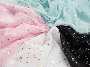 Der weiche Feintüll "Elsa" von Swafing Stoffe ist mit silberfarbenen, schillernden Sternen aus Hologrammfolie versehen. Farbe: schwarz - silber Perfekt für Tüllröcke, Himmelbetten, Schultüten oder auch als Dekostoff geeignet. Material: 100% Nylon Breite: 147cm Gewicht: 55g/m² Der Stoff ist nicht waschbar. Der Verkauf erfolgt in Meterschritten.