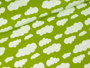 Schöner Baumwolljersey aus der Vicente Serie mit weißen Wolken. Farbe: gelbgrün-weiß Material: 92%Baumwolle/8%Elastan Breite: 160cm Zertifizierung: Öko-Tex-Standard 100 Waschbar bei 30 Grad, bügeln Stufe 1   Gewicht: ca. 220 g/m²