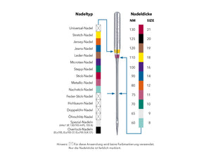 "Schmetz" Jeans-Nadeln 130/705H-J Flachkolbennadeln - für alle gängigen Haushaltsnähmaschinen geeignet. 5 Stück bestehend aus: 2x Stärke 90/14 2x Stärke 100/16 1x Stärke 110/18 Lieferumfang: 1 Packung (5 Stück) Tipp: Die mittlere Kugelspitze verdrängt Gewebefäden. Die Nadel sticht in die Zwischenräume ein, was die Einstichkraft verringert und zu weniger Nadelbruch führt. Geeignete Stoffe Feste, dicke Stoffe: Jeans Köper Segeltuch