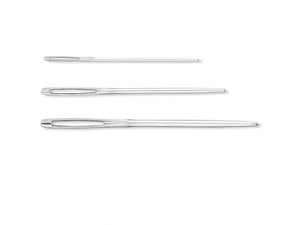 Für Stickereien und Näharbeiten an Strickwaren eignen sich die drei Wollnadeln ohne Spitze. Sie sind aus rostgeschütztem Stahl gefertigt und verfügen über ein großes Öhr zur Verwendung von mittelgrober und grober Wolle. Die abgerundete Spitzenform schont die Fasern der Wolle und die Knüpfmatte. Aufgrund ihrer Eigenschaften eignen sich die Wollnadeln auch für die Arbeit an Smyrna-Teppichen. In der Packung sind...