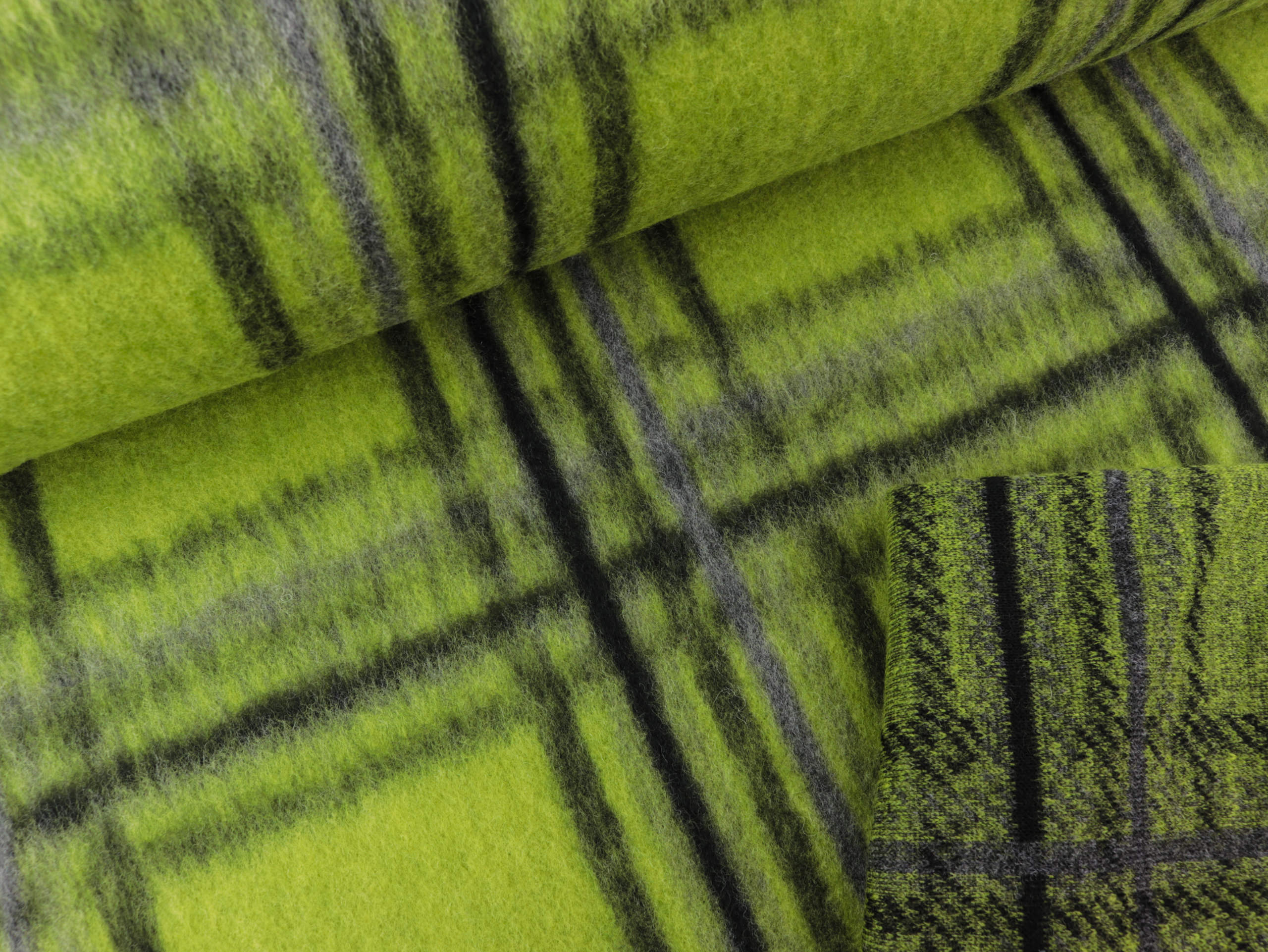 Weicher und sehr angenehm zu tragender Mantel-und Jackenstoff mit einer gebürsteten wollartigen (aufgerauten) Außenseite. Die Innenseite ist glatt. Der Stoff ist durchgefärbt.
