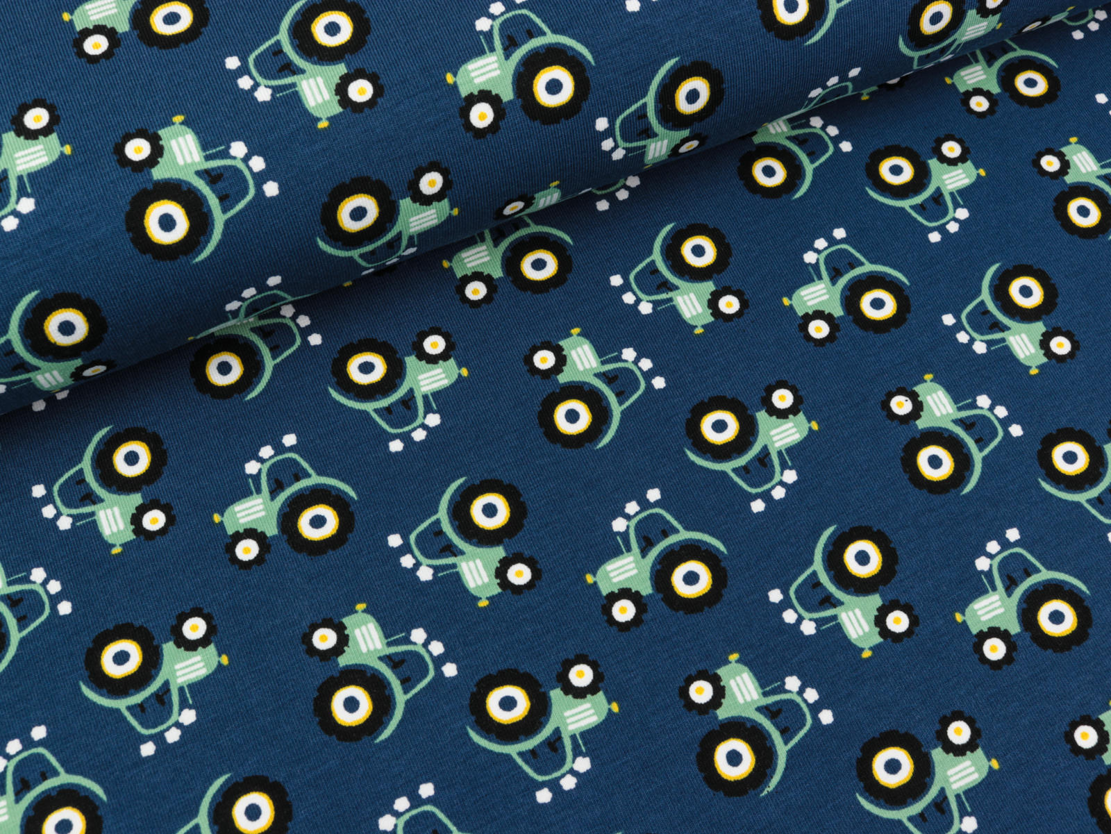 Ein weicher Baumwolljerseystoff mit kleinen Traktoren.