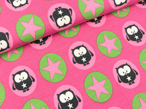 Weicher Baumwollsweat aus der Serie "Mea" von Swafing Stoffe. Die Sterne haben einen Durchmesser von ca. 4,5cm. Muster: Eulen und Sterne Farbe: pink - grün - rosa - tiefblau Material: 95%Baumwolle/ 5%elastan Breite: 155cm Waschbar bei 30 Grad.
