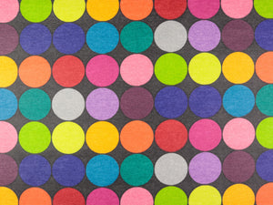 Beschichtete Baumwolle in schwarz mit bunten Punkten. Ideal zum Nähen von Täschchen, Kosmetiktaschen, Lunchpaketen, Tischdecken, Regenbekleidung. Die Punkte haben einen Durchmesser von ca. 5cm. Material: 50% Baumwolle / 50% Polyester Breite: 140cmWaschbar bei 30°, auf der Rückseite bügelbar!