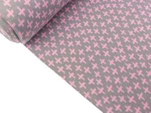 Tolle glatte Bündchenware Karla aus dem Hause Swafing. Das Bündchen ist jacquardgestrickt. Durch seine Breite von 100cm kann der Stoff auch für Bekleidung verwendet werden. Die Kreuze sind ca. 1x1cm groß. Muster: Kreuze Farbe: rosa - hellgrau Material: 95% Baumwolle / 5%Elastan Breite: 100cm (im Schlauch gestrickt) Gewicht: ca. 260g/m² Zertifizierung: Öko-Tex-Standard 100 Waschbar bei 30 Grad. Bitte keine Waschmittel...