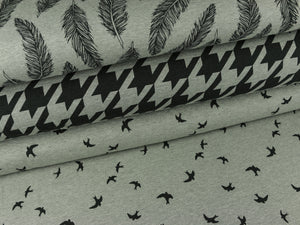 Toller Sweatshirtstoff "Bielefeld" in hellgrau mit schwarzen Federn.Innen ist der Stoff angeraut. Muster: Federn Material: 67%Baumwolle/27%Polyester/6%Elastan Breite: 160cm Zertifizierung: Öko-Tex-Standard 100 Gewicht: 290 g/m² Waschbar bei 30 Grad.