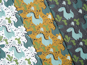 Weicher und elastischer Baumwollsweat "Basel" von Swafing Stoffe. Der Stoff ist innen ganz leicht angeraut. Muster: Dinosaurier Farbe: ocker - bunt Material: 95% Baumwolle / 5% ElastanBreite: 160cm Gewicht: ca. 260g/m² Zertifizierung: Öko-Tex-Standard 100 Waschbar bei 30 Grad. Bitte immer auf Links waschen. Nicht in den Trockner geben und nur von Links bügeln auf Stufe 1.