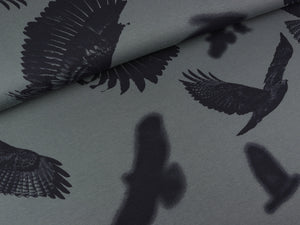 Wundervoller weicher Baumwollsweat mit großen Adlern. Der Sweat ist innen weich angeraut. Design: Mies & Moos Kollektion Der größte Adler hat eine Flügelspannweite von ca. 40,5cm. Farbe: grau - schwarz Material: 95% Baumwolle / 5% Elastan Breite: 150cm Zertifizierung: Öko-Tex-Standard 100 Gewicht: ca. 250g/m² Waschbar bei 30 Grad. Bitte keine Waschmittel mit optischem Aufheller verwenden.